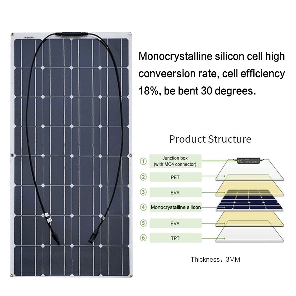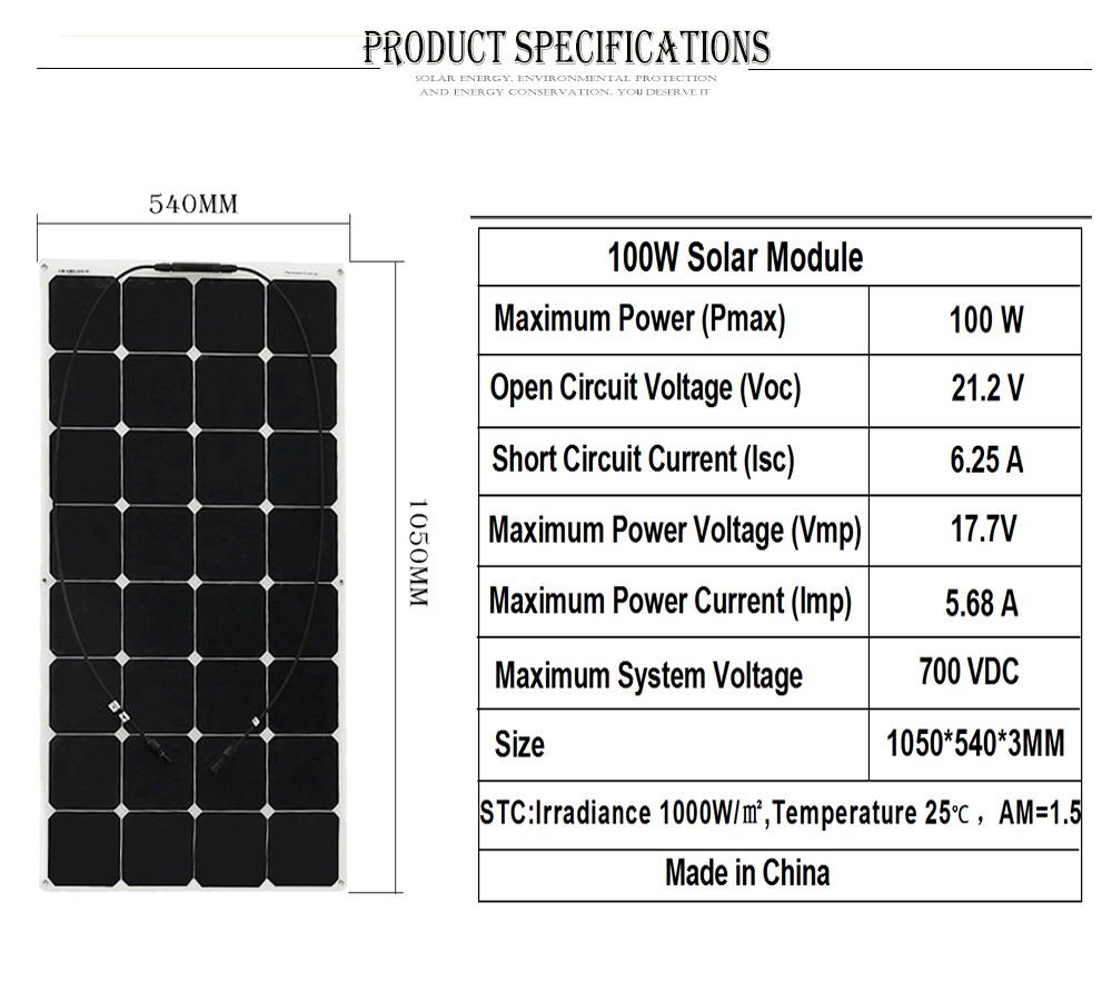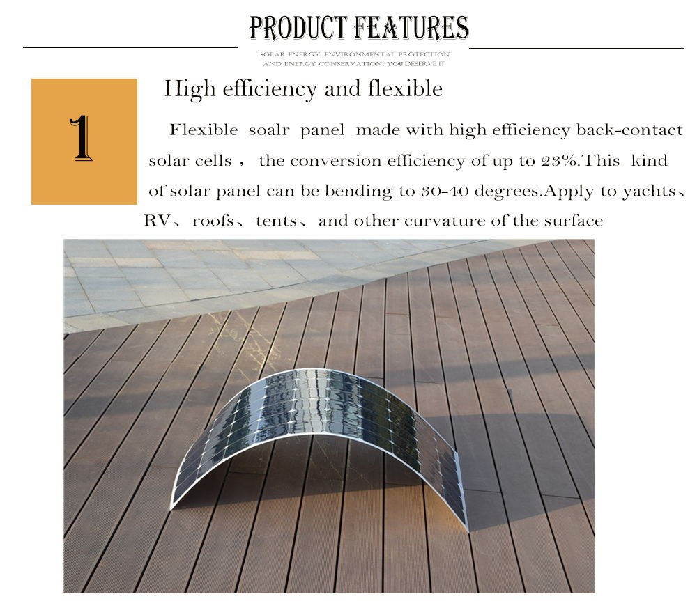 High Conversion Rate, High Performance. High Conversion Rate and High Efficiency Semi flexible and lightweight, and can be moderately Curved Resistance to the resistance, Can Resist different environment, waterproof performance is good. High stability, good durability SunPower – chip, you can use a car, Home, Boat, Motorcycle, etc. Suitable for car batteries, car, RV, Boat, Ship, aircraft, Satellites, Space stations, outdoor breeding, Planting, Tourism, Solar Street Lamp.