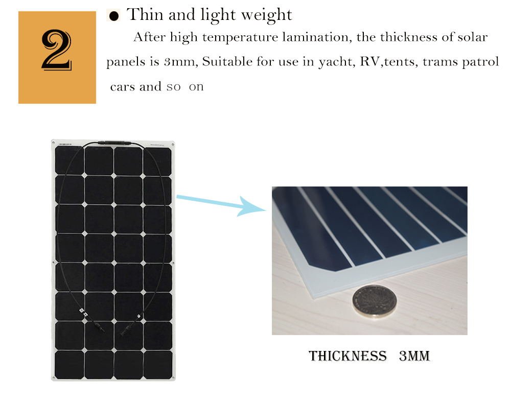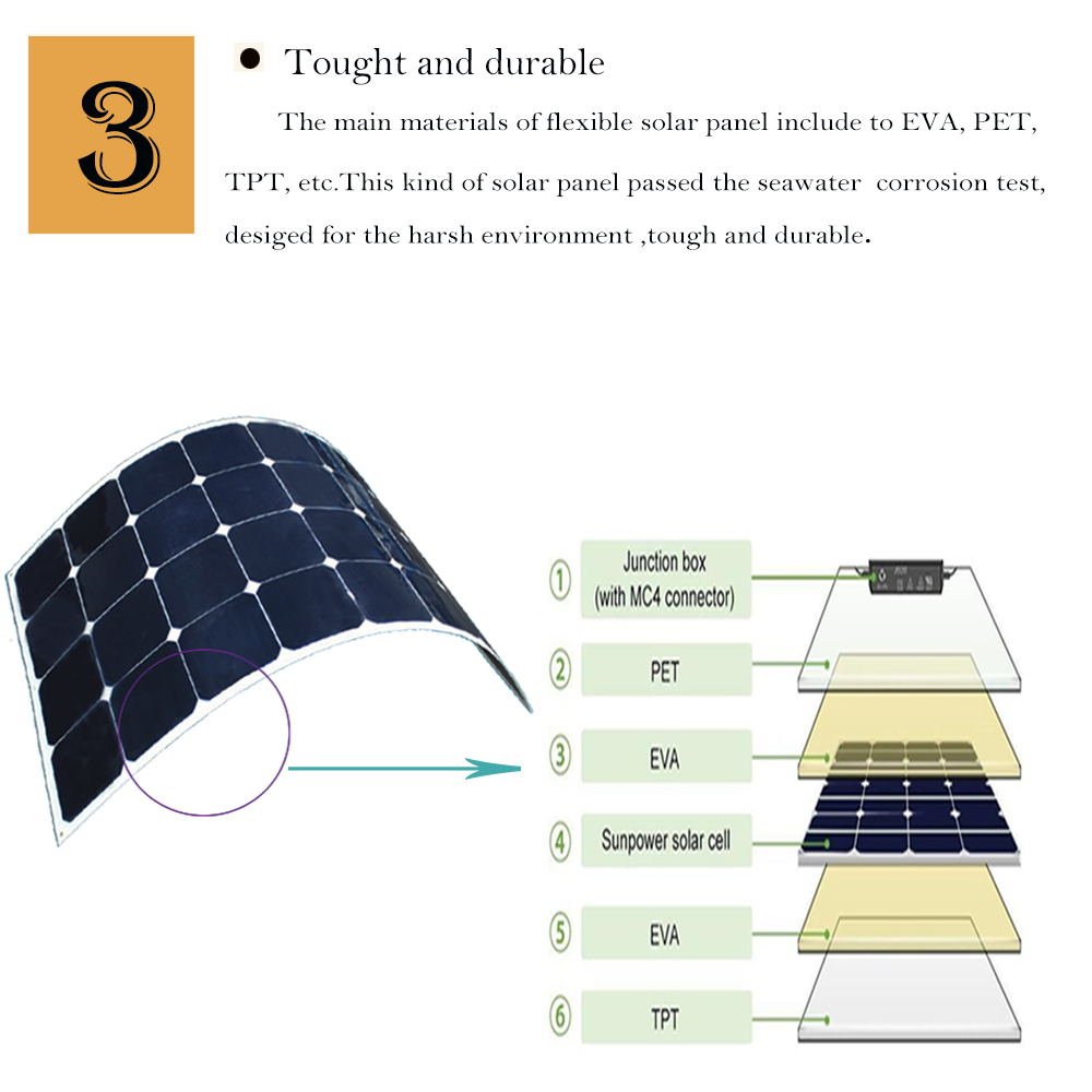 High Conversion Rate, High Performance. High Conversion Rate and High Efficiency Semi flexible and lightweight, and can be moderately Curved Resistance to the resistance, Can Resist different environment, waterproof performance is good. High stability, good durability SunPower – chip, you can use a car, Home, Boat, Motorcycle, etc. Suitable for car batteries, car, RV, Boat, Ship, aircraft, Satellites, Space stations, outdoor breeding, Planting, Tourism, Solar Street Lamp.